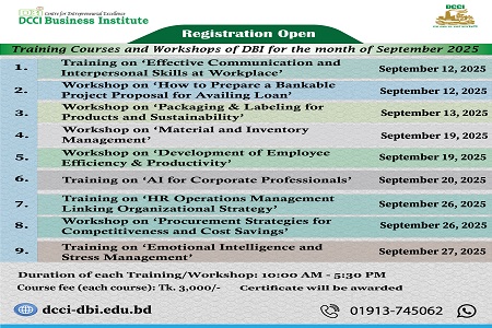 DCCI Business Institute (DBI) is offering following in-person day long Training Courses and Workshops to be held in September 2025 at DBI, Dhaka Chamber Building (11th floor), 65-66 Motijheel C/A, Dhaka-1000.
