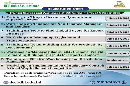 DCCI Business Institute (DBI) is offering following in-person day long Training Courses and Workshops to be held in October 2025 at DBI, Dhaka Chamber Building (11th floor), 65-66 Motijheel C/A, Dhaka-1000.