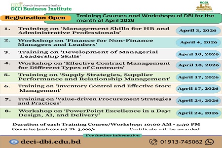 DCCI Business Institute (DBI) is offering following in-person day long Training Courses and Workshops to be held in April 2026 at DBI, Dhaka Chamber Building (11th floor), 65-66 Motijheel C/A, Dhaka-1000.